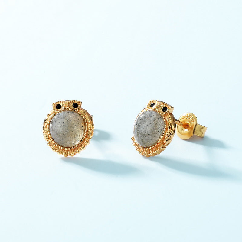 S925 Sterling Silver Jewelry Earrings Natural Labradorite Gemstone Cute Owl Style Earrings