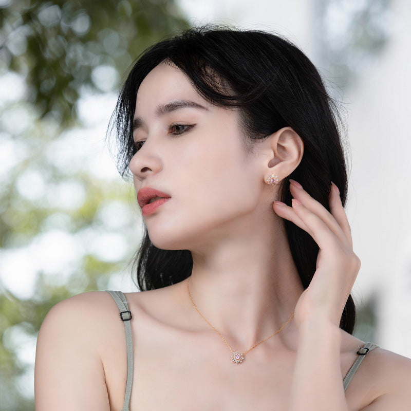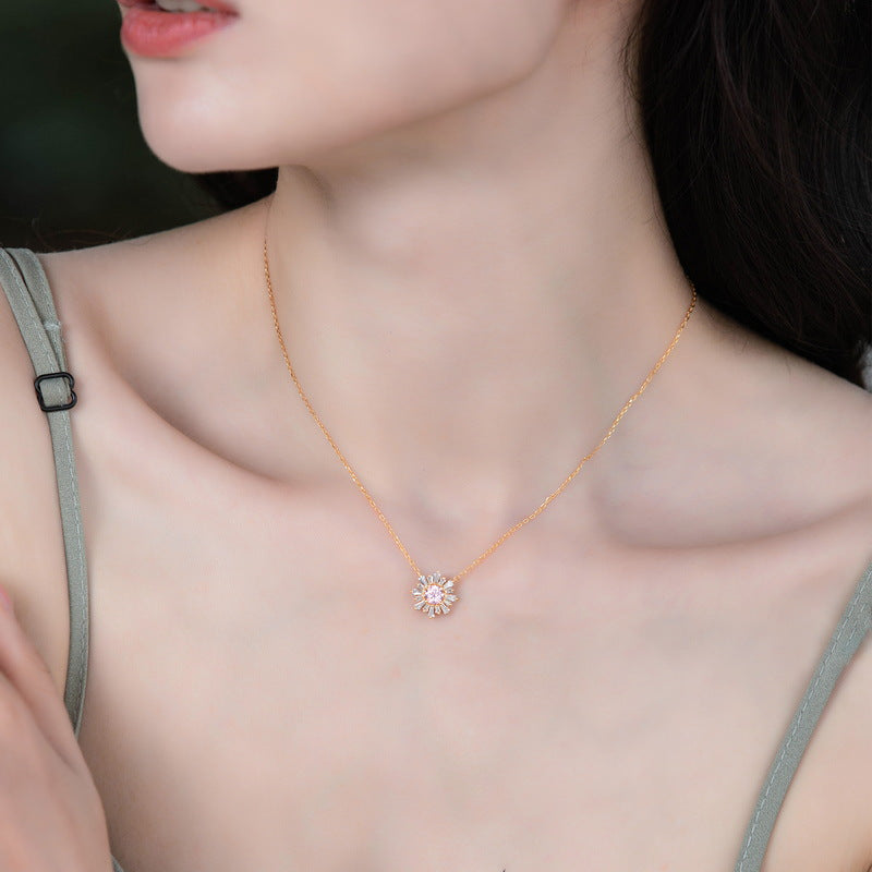 S925 Sterling Silver Jewelry Necklace Pink Zircon Gemstone Sunflower Style Charms Necklace