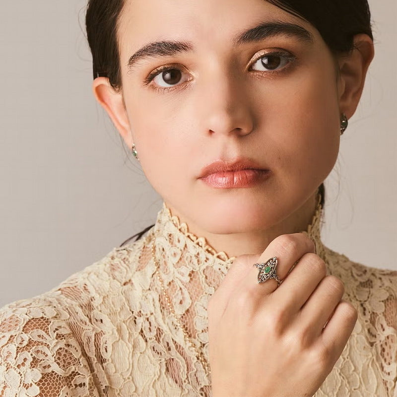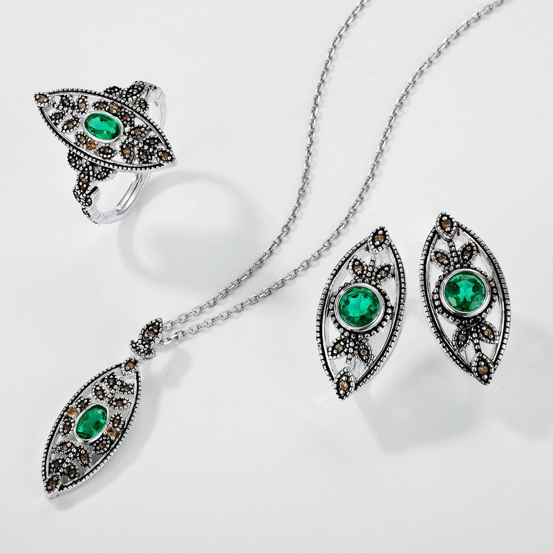 S925 Sterling Silver Jewelry Ring Lab Grown Emerald Gemstone Vintage Leaf Style Ring