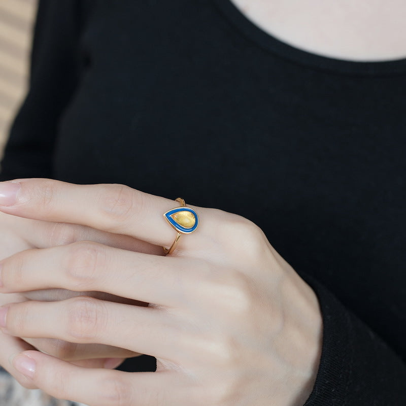 S925 Sterling Silver Jewelry Ring Natural Amber Vintage Enamel Water Drop Style Rings