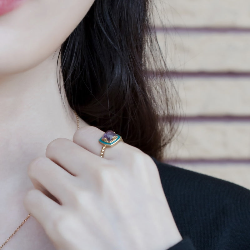 S925 Sterling Silver Jewelry Ring Natural Amethyst Gemstone Enamel Square Style Rings